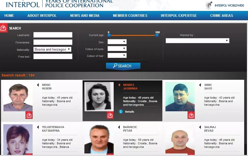 U centralnom registru Interpola trenutno se nalaze imena 154 državljanina BiH za kojima su raspisane potjernice, a među njima su osumnjičeni za ratne zločine, ubistva i teška ubistva, šverc drogom, pljačke, silovanja, finansijski kriminal i brojna druga krivična djela, piše novinska agencija Patria.