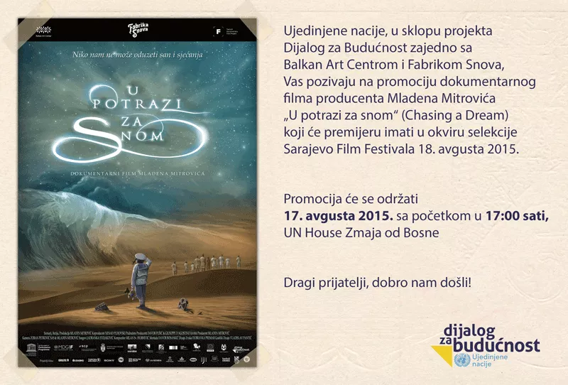 Ujedinjene nacije, u sklopu projekta Dijalog za budućnost zajedno sa Balkan Art Centrom i Fabrikom Snova, promovisat će dokumentarni film producenta Mladena Mitrovića „U potrazi za snom“ (Chasing a Dream), koji će premijeru imati u okviru selekcije Sarajevo Film Festivala 18. avgusta, prenosi novinska agencija Patria.