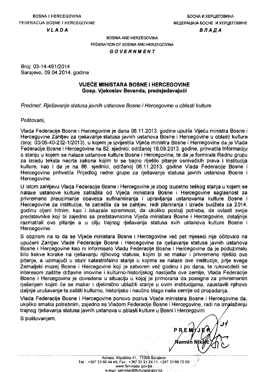 Nikšić je podsjetio Bevandu da je Vlada FBiH još 6. novembra 2013. godine uputila Zahtjev za rješavanjem statusa ovih ustanova VM BiH, te da je Vlada FBiH formirala Radnu grupu za izradu nacrta teksta zakona kojim bi se trajno riješilo pitanje osnivačkih prava i institucija kulture.