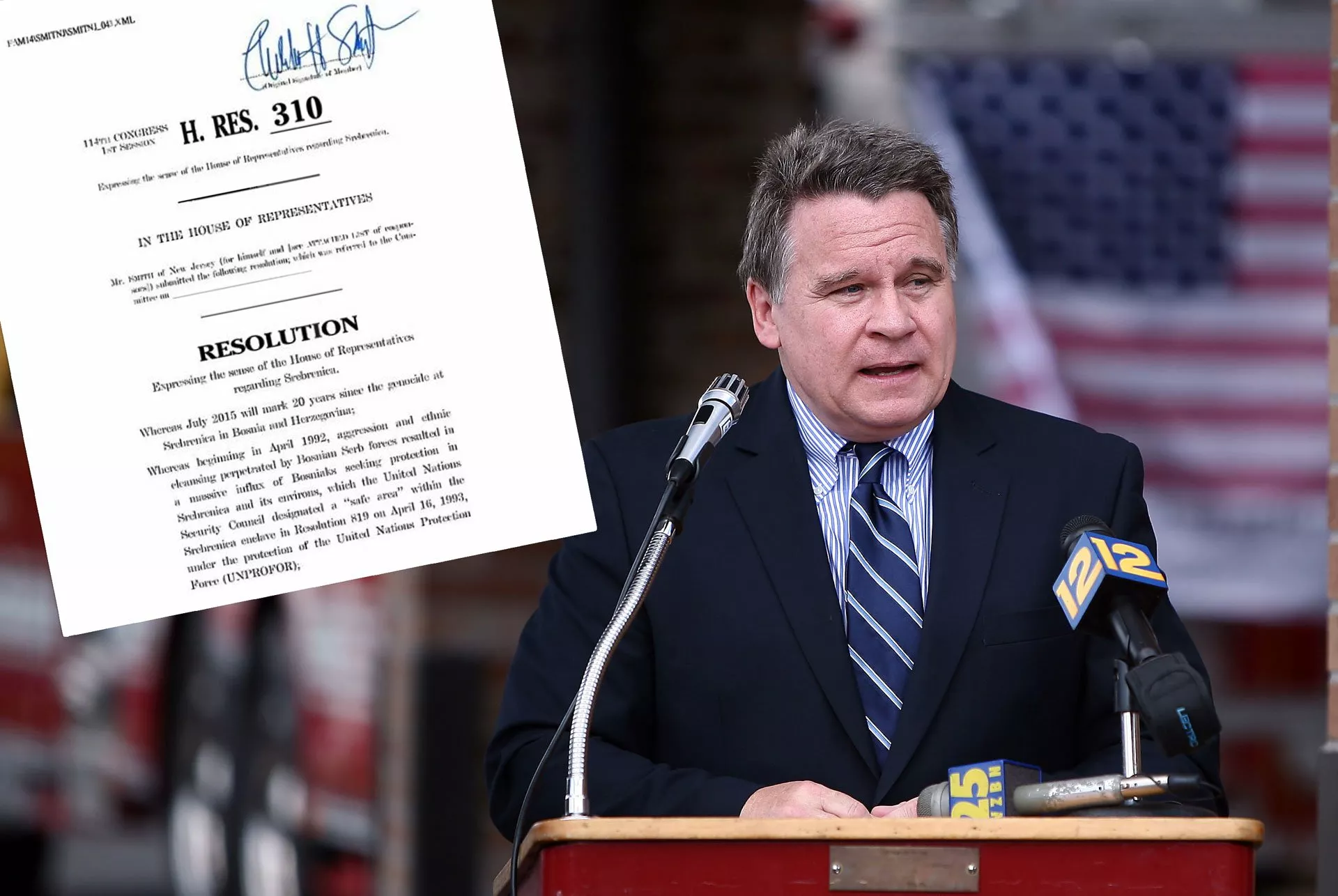 Chris Smith, republikanski poslanik Kongresa Sjedinjenih Američkih Država predstavio je jučer u Washingtonu Rezoluciju 310 koja osuđuje genocid u Srebrenici, a Rezolucija ima podršku 28 kongresmena (14 republikanaca i 14 demokrata), prenosi bh. novinska agencija Patria.