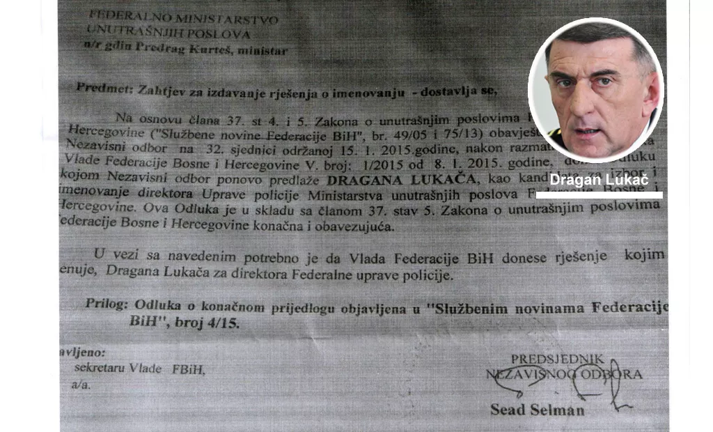 Sead Selman, predsjednik Nezavisnog odbora PFBiH koji je ponovo imenova Dragana Lukača na mjesto direktora Federalne uprave policije uprkos zaključku Vlade FBiH da se konkursna procedura poništi i uradi po novom Zakonu o untrašnjim poslovima FBiH, ne odustaje od namjere da Lukač što prije ponovo sjedne u fotelju, piše novinska agencija Patria.
