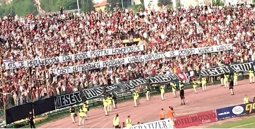 Veliki transparent "17.5. je Međunarodni dan borbe protiv homofobije. U čast sutrašnjeg praznika vašeg, napušite se dobro k... našeg" istaknut je na sjevernoj tribni, a iako je na utakmici bio veliki broj policajaca i drugih organa reda niko nije reagirao niti uklonio transparent.