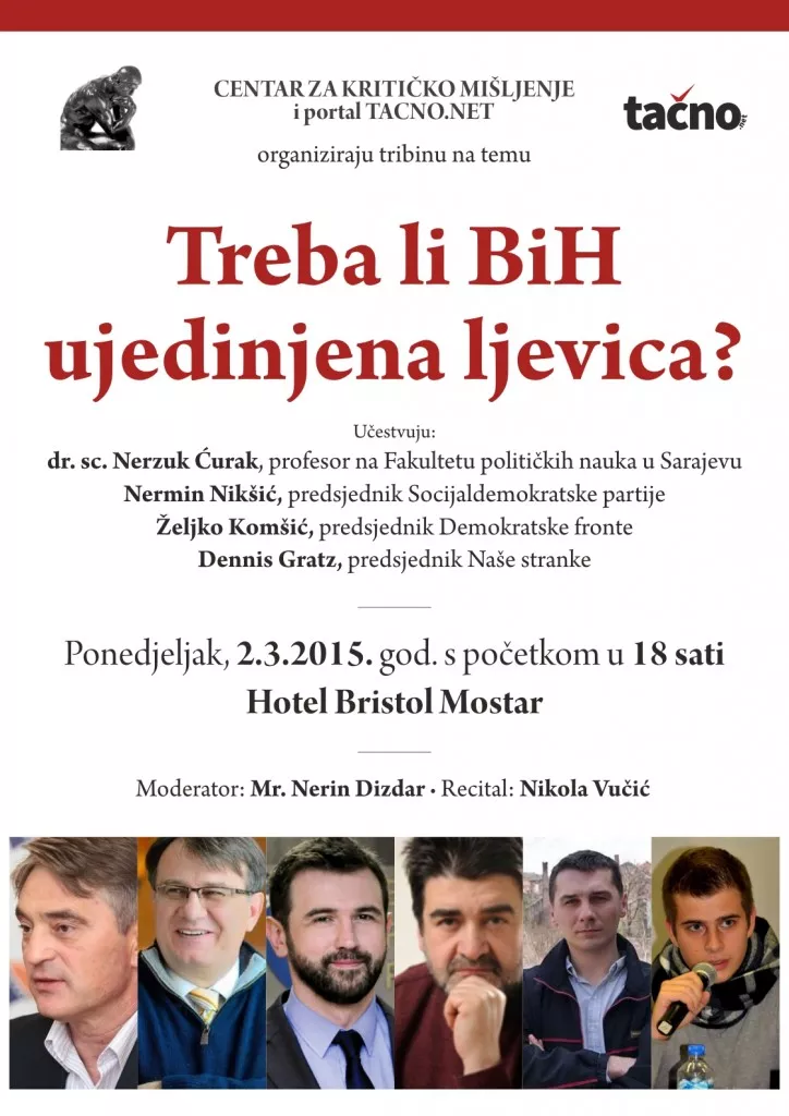 Danas će u kongresnoj sali hotela Bristol u Mostaru, u organizaciji Centra za kritičko mišljenje i portala Tačno.net, biti održana tribina na temu "Treba li Bosni i Hercegovini ujedinjena ljevica?", piše novinska agencija Patria.