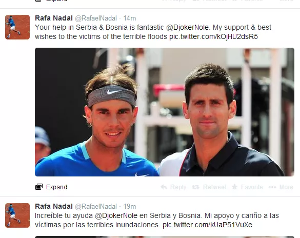 Prvi igrač na ATP listi Španac Rafale Nadal na svom Twiter profilu ostavio je poruku u kojoj je spomenuo srbijanskog tenisera Novaka Đokovića. On je napisao da to što Đoković pomaže Srbiji i Bosni i Hercegovini je fantastično, piše Patria.