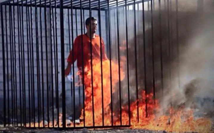 Prema pisanju jedne grupe koja prati IS-ove stranice, a koju prenosi Washington post, na kraju ovog videa al-Kasasbeh je prikazan kako stoji u kavezu, dok ga IS-ovi borci živog pale.