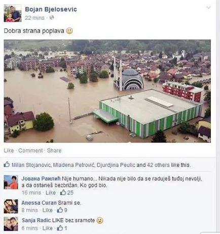 Izvjesni Bojan Bjelošević iz Prnjavora svojim stausom na Facebooku jučer je pokazao da četništvo ne izumire ni u najtežim situacijama, piše novinska agencija Patria. Bjelošević je na Facebooku napisao kako „postoji i dobra strana poplava“, a pri tome je kao ilustraciju koristio fotografiju potopljenog Maglaja na kojoj je prikazana džamija u vodi.