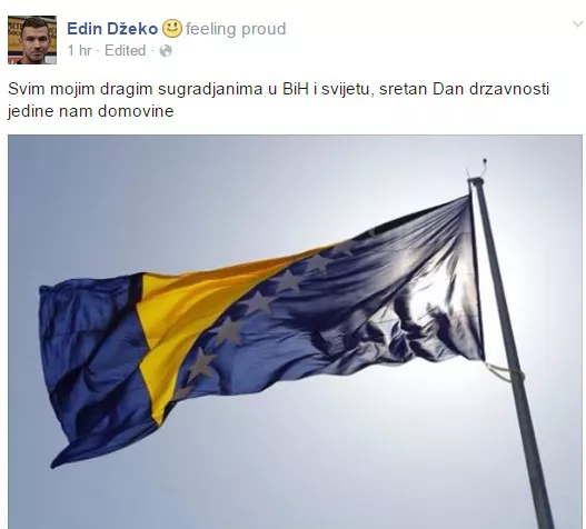Edin Džeko, kapiten reprezentacije BiH i član Manchester Cityja putem društvenih mreža jutros je čestitao Dan državnosti BiH, prenosi novinska agencija Patria.