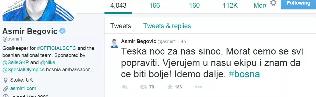 Golman fudbalske reprezentacije BiH i Stoke City-a Asmir Begović na Twitter profilu ostavio je iskren komentar nakon poraza od selekcije Kipra u prvoj kvalifikacionoj utakmici za Evropsko prvenstvo 2016 u Francuskoj, piše bh. novinska agencija Patria. Utakmica na Bilinom Polju završena je rezultatom 2:1.