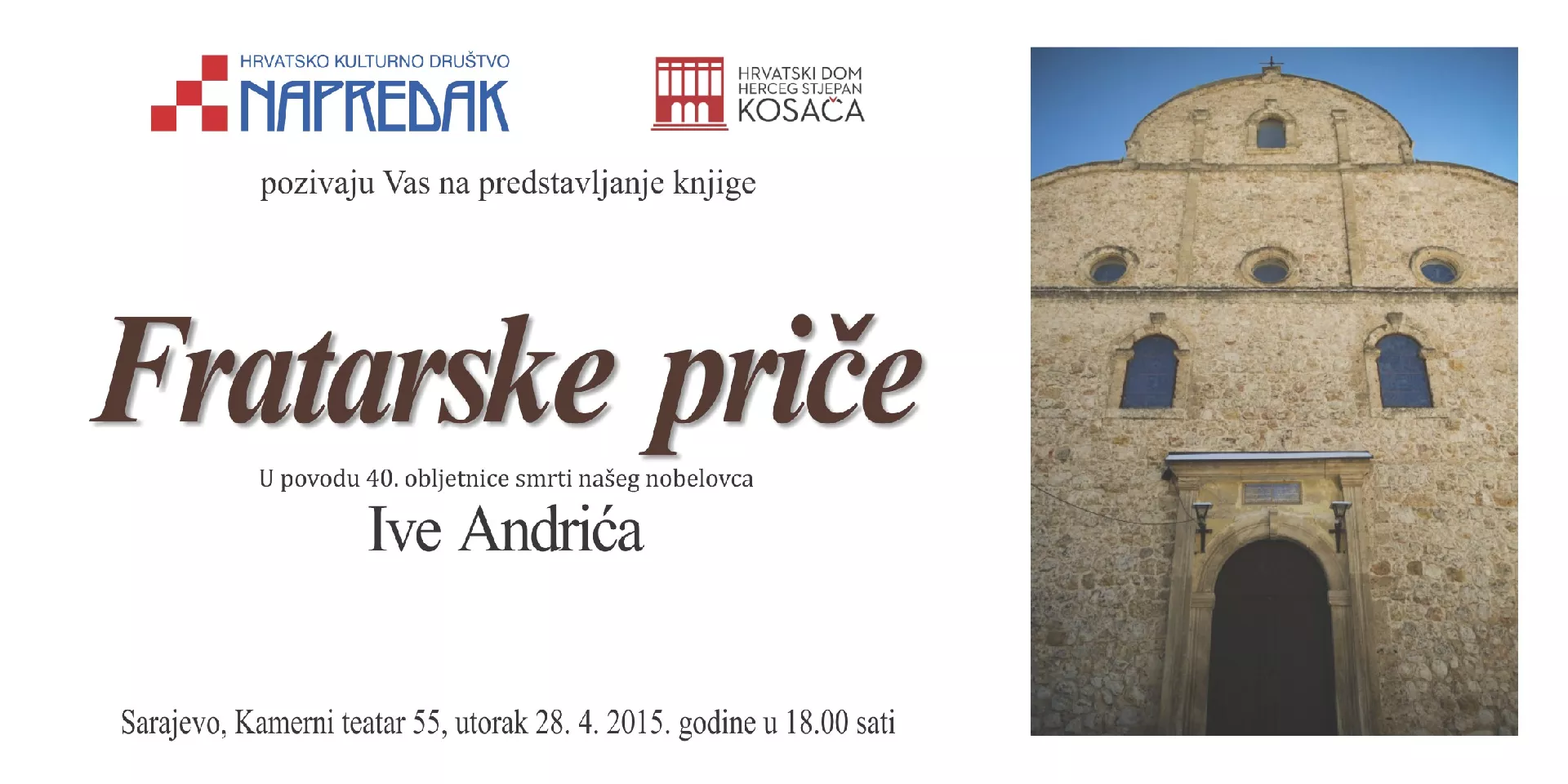 Knjiga „Fratarske priče Ive Andrića„ u izdanju Hrvatskog doma Hercega Stjepana Kosače, te Hrvatskog kulturnog društva Napredak, bit će promovirana 28. aprila 2015. godine u Kamernom teatru 55 u Sarajevu.