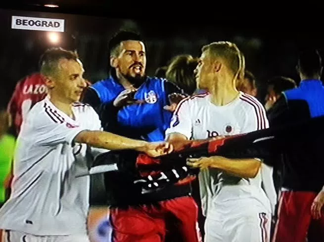 Transparent na kom je prikazana mapa velike Albanije spušten je na teren iz bespilotne letjelice što je izazvalo bijes domaćih navijača, a onda je uslijedio i fizički obračun igrača zbog čega je engleski sudija Martin Atkinson prekinuo meč te ih poslao u svlačionicu.