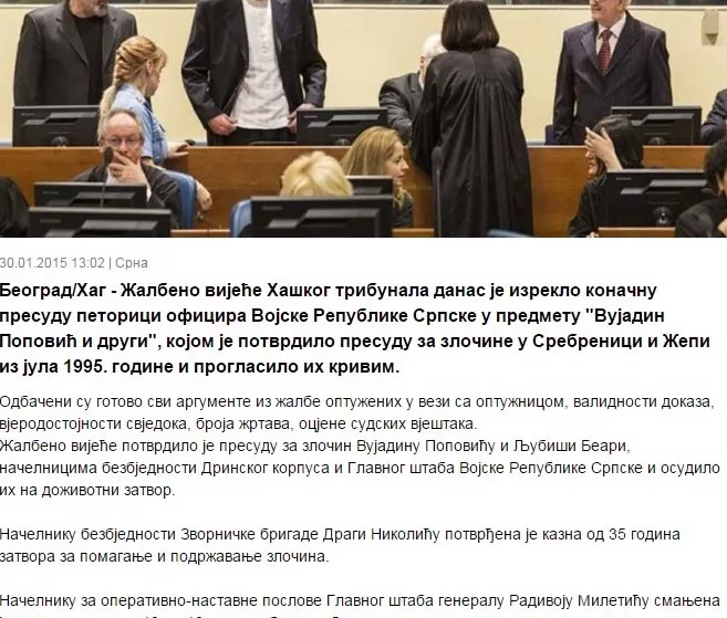 Vijest da je Žalbeno vijeće Haškog tribunala danas Vujadinu Popoviću i Ljubiši Beari potvrdili presudu za genocid i koji su osuđebi na doživotne kazne zatvora prenijeli su i mediji u Srbiji, ali i manjem bh. entitetu (Republici Srpskoj), ali u izvještajima niti jednom rječju ne spominju genocid, piše novinska agencija Patria.