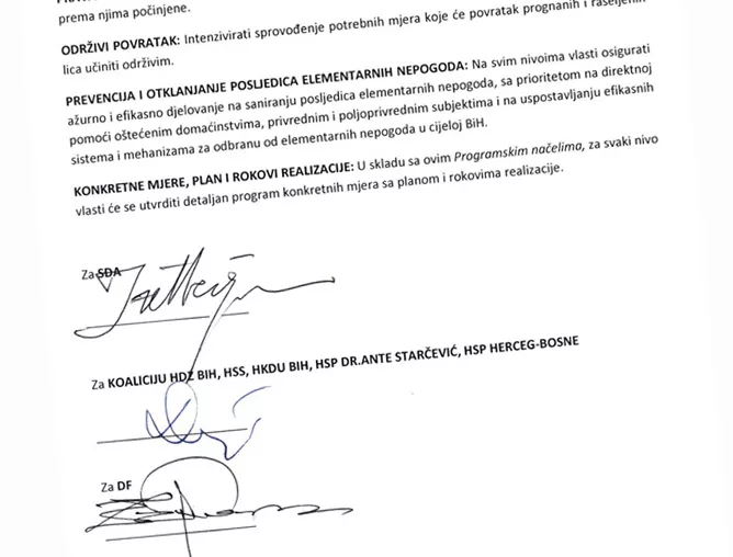 Lider Hrvatske demokratske zajednice BiH (HDZ-a BiH), Stranke demokratske akcije (SDA) i Demokratske fronte Željko Komšić (DF) Dragan Čović, Bakir Izetbegović i Željko Komšić potpisali su u zgradi Predsjedništva BiH u utorak poslije podne sporazum o zajedničkom djelovanju u vlasti BiH na svim nivoima, piše bh. novinska agencija Patria (NAP).