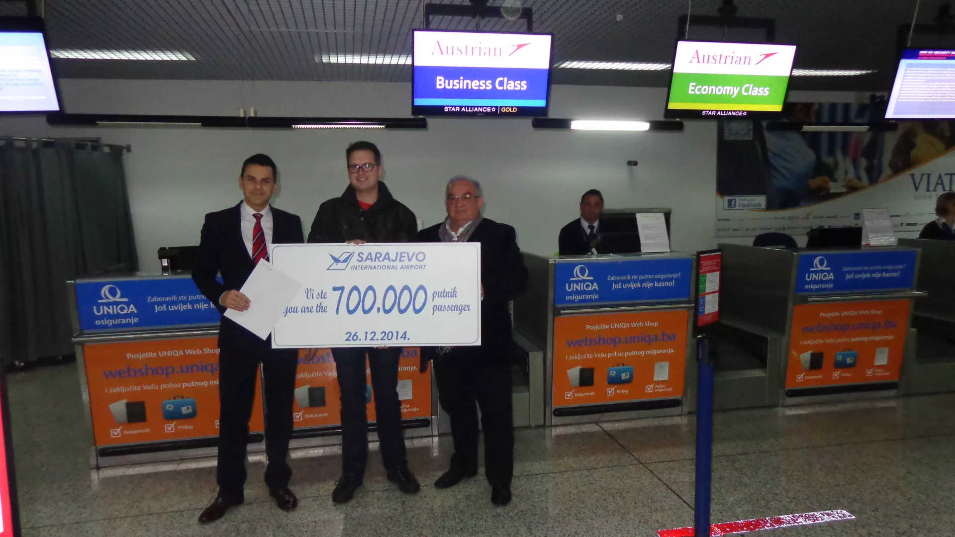 Direktor Međunarodnog aerodroma Sarajevo Ivan Veličan jubilarnom 700.000-om putniku uručio je poklon-bon za kupovinu u Duty free-bescarinskoj prodavnici, a gratis povratnu kartu za Beč putniku je uručio predstavnik Austrian Airlinesa Ismar Ibrahimović.