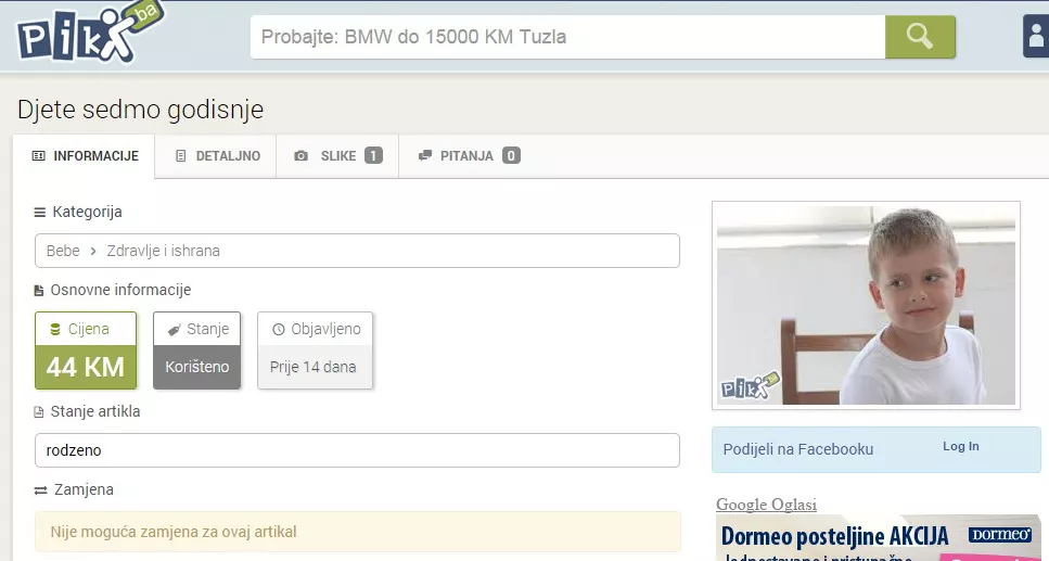 Na internet pijaci pik.ba od 5. novembra nalazi se oglas u kojem se prodaje sedmogodišnje dijete po imenu Senad za 44 KM, piše bh. novinska agencija Patria.