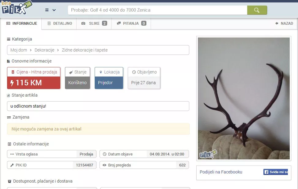 Teška finansijska situacija brojne bh. građane natjerala je da prodaju nakit ili druge vrijednosti koje imaju kako bi osigurali egzistenciju. Međutim, na internet stranici pik.ba početkom ovog mjeseca objavljen je neobičan oglas u kojem se prodaju jelenovi rogovi po cijeni od 115 KM, piše bh. novinska agencija Patria.