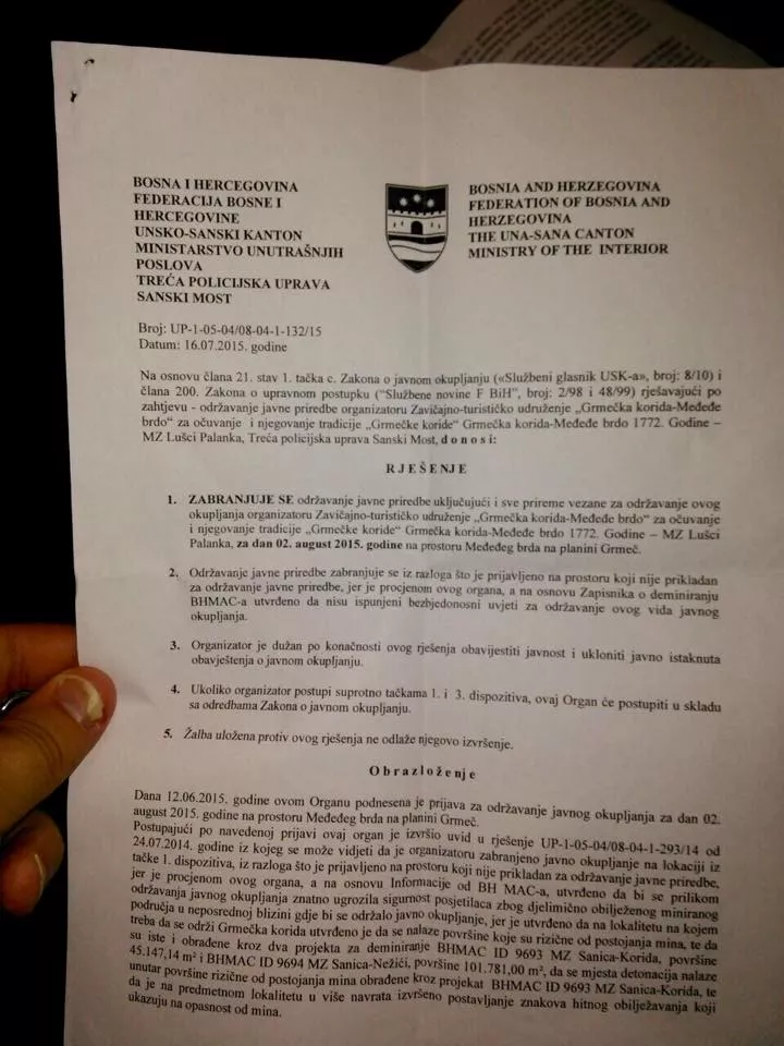 - Najvećim dijelom  površina granični sa rizičnom i sumnjivom površinom te je postavljena  polutrajna ograda. Minske oznake su vidljive na terenu. Stoga smatramo da nisu ispunjeni bezbjedonosni uvjeti za održavanje spomenutog javnog okupljanja, s aspekta postojanja latentne opasnosti  od aktiviranja zaostalih eksplozivnih sredstava iz rata.