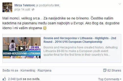 - Mali momci, velikog srca... Za nasljednike se ne brinemo. Čestitke našim kadetima na plasmanu među osam najboljih u Evropi. Ako Bog da, dogodine idemo i mi vašim stopama – napisao je Teletović na Facebook-u.