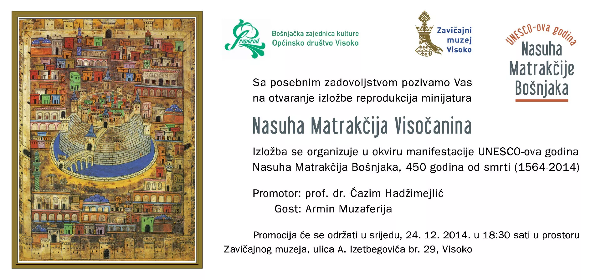 U sklopu manifestacije UNESCO-va godina Nasuha Matrakčije Bošnjaka (450 godina od smrti) BZK Preporod Visoko u saradnji sa Zavičajnim muzejom Visoko prvi put u Bosni i Hercegovini organizuje izložbu reprodukcija minijatuara Nasuha Matrakčije Visočanina, prenosi novinska agencija Patria.