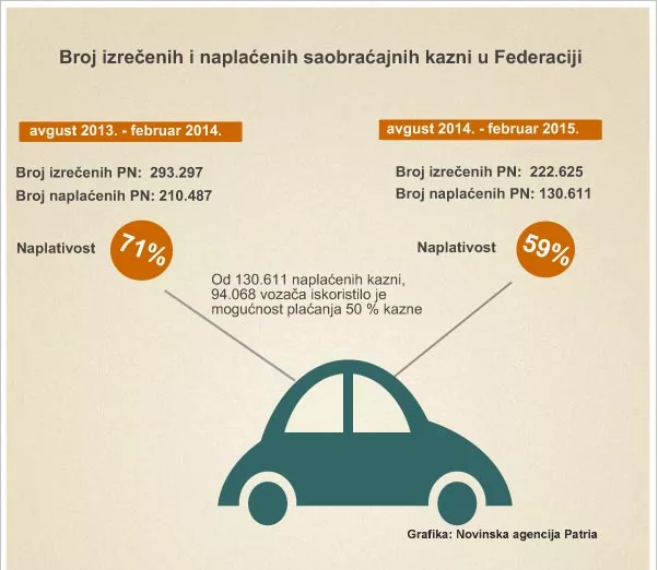 Od avgusta prošle do februara ove godine vozači u Federaciji su napravili 222.625 prekršaja. Od toga, naplaćeno je 59 % ili 130.611 prekršaja. Tek nešto više od 70 % vozača iskoristilo je mogućnost plaćanja 50 % kazne.