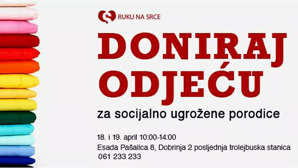 Ukoliko u svom ormaru imate odjeće koju više ne koristite, a mogla bi nekome pomoći, možete je donirati 18. i 19. aprila u terminu od 10 do 14 sati u prostorijama udruženja na adresi Esada Pašalića 8 (Dobrinja II – posljednja trolejbuska stanica).