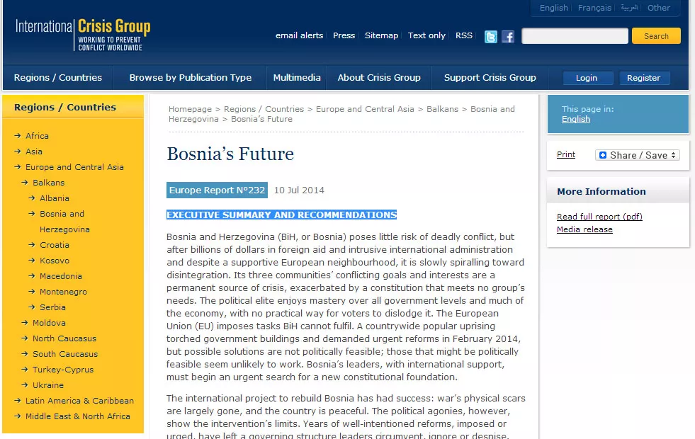 Srce problema je dejtonskom ustavu, smatraju iz ICG. Potreban je novi dizajn, normalna federacija, teritorijalno definirana, ali bez posebnih uloga konstitutivnih naroda i odgovorna prema interesima i pravima svih zajednica i građana.