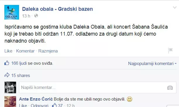 - Ispričavamo se gostima kluba Daleka obala, ali koncert Šabana Šaulića koji je trebao biti održan 11.07. odlažemo za drugi datum koji ćemo naknadno objaviti - navodi se.