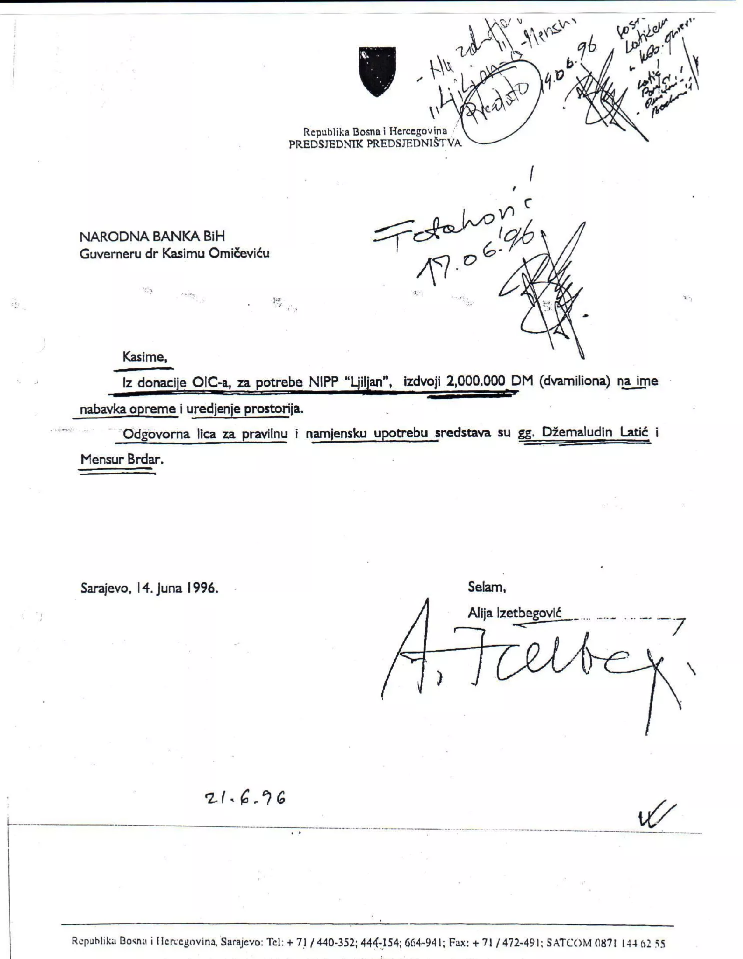 - Kasime (Omičević, guverner Narodne banke BiH op.a), iz donacije OIC-a (Organizacije islamske konferencije), za potrebe NIPP „Ljiljan“ izdvoji 2.000.000 DM (dva miliona) na ime nabavke opreme i uređenja prostorija. Odgovorna lica za pravilnu i namjensku upotrebu sredstava su g. Džemaludin Latić i Mensur Brdar, napisao je u svojoj odluci 14. juna 1996. godine predsjednik Predsjedništva BiH Alija Izetbegović.