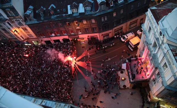 Baklje, pjesma i sreća širili su se Koševom, a slavlje se nastavlja u centru grada kod Vječne vatre. Saobraćaj je već blokiran, a rijeka navijača krenula je glavnom saobraćajnicom prema Vječnoj vatri.