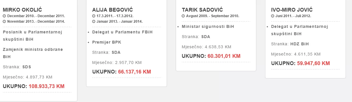 Predsjednici, premijeri, ministri, njihovi zamjenici i savjetnici te poslanici i rukovodioci nekih državnih institucija mogu primati plaću i nakon okončanja mandata. Ovo pravo daju im zakoni koje su sami napisali i usvojili na državnom, entitetskim i kantonalnim nivoima vlasti, prenosi novinska agencija Patria.