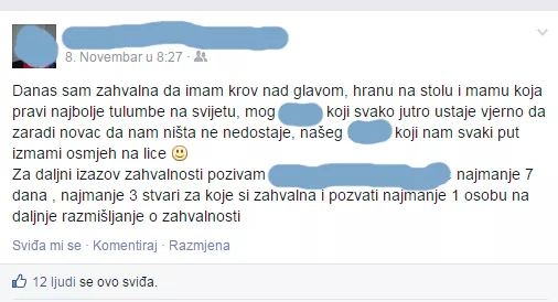 Dok su se u kampanji „Ice Bucket Challenge“ učesnici morali poljevati hladnom vodom, a onda kandidirati i prijatelje koji su radili isto, učesnici u kampanji „Izazov zahvalnosti“ ni izbliza nemaju tako težak zadatak. Njihova obaveza je da sedam dana na svom Facebook profilu pišu najmanje tri stvari zbog kojih su zahvalni taj dan, a na kraju svakog dana trebaju kandidirati najmanje jednu osobu da to urade isto.