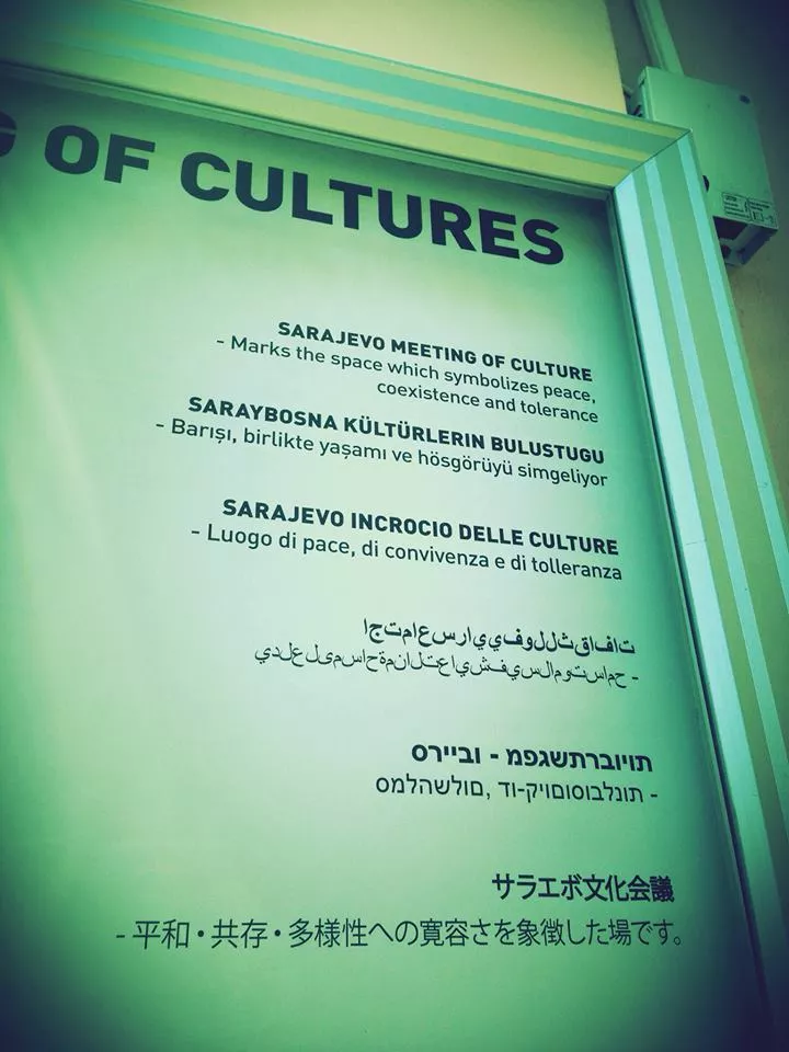 - Još jedan dokaz kakvi smo strašni amateri po pitanju reklamiranja samih sebe i kako kod nas vlada onaj princip 'hajde ba': arapska i hebrejska slova su naopako, arapska još nepovezana, razmaka ni za lijeka. Na turskom iza buluştuğu fali imenica. Na engleskom malo 'of cultures', malo 'of culture'. Istina, nije neka nauka napraviti ovakav pano. Ali je grehota (i provala) suštinski lijepu ideju realizirati... "eto 'nako" – napisao je Mešić pojašnjavajući da je kod arapskog i hebrejskog naopak redoslijed slova jer su napisana s lijeva ne desno, umjesto s desna na lijevo.