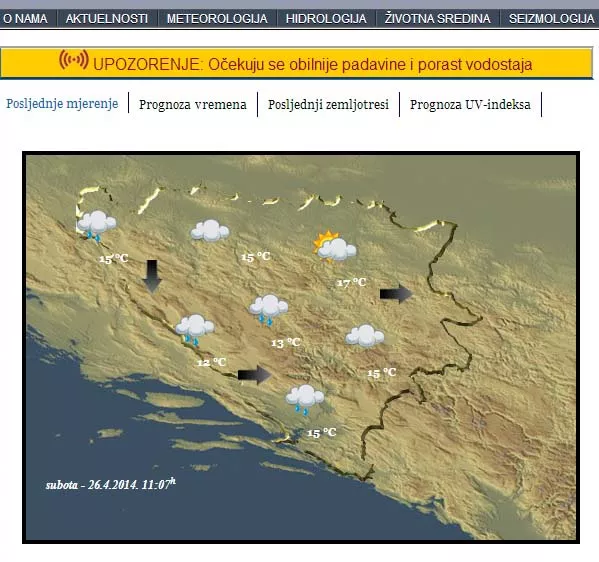 Nestabilne vremenske prilike očekuju se i danas, a na stranici Federalnog hidrometeorološkog zavoda izdato je upozorenje u kojem se navodi da se očekuju obilne padavine i porast vodostaja, prenosi novinska agencija Patria. Također meteorolozi upozoravaju na atmosferski pritisak koji danas u Sarajevu iznosi 937 milibara i za pet milibara je niži od normalnog i sporo opada.