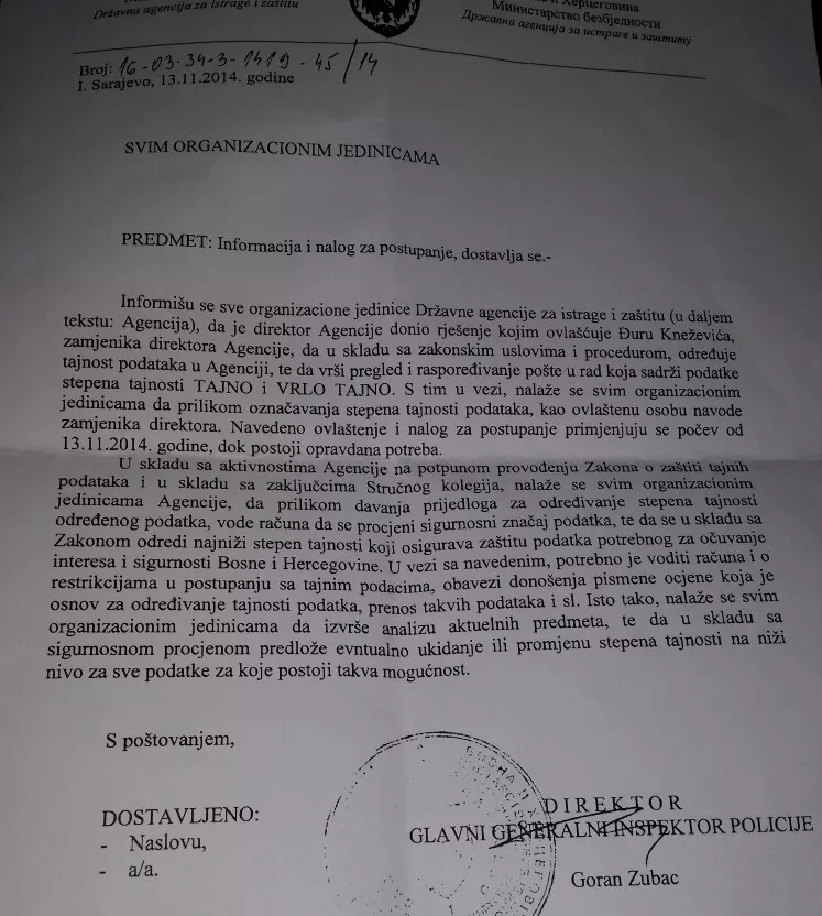 Nedavno je objavljeno kako je Goran Zubac, direktor Agencije za istrage i zaštitu BiH (SIPA), potpisao 13. novembra informaciju i nalog za postupanje, u kojem se, između ostalog, navodi da je on kao direktor SIPA ovlastio Đuru Kneževića, svog zamjenika, "da u skladu sa zakonskim uslovima i procedurom, određuje tajnost podataka u Agenciji, vrši pregled i raspoređivanje pošte u rad koja sadrži podatke stepena tajnosti TAJNO i VRLO TAJNO", piše novinska agencija Patria.