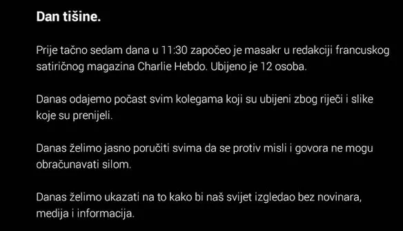 Prije tačno sedam dana u 11:30 započeo je masakr u redakciji francuskog satiričnog magazina Charlie Hebdo. Ubijeno je 12 osoba. Danas odajemo počast svim kolegama koji su ubijeni zbog riječi i slike koje su prenijeli. Danas želimo jasno poručiti svima da se protiv misli i govora ne mogu obračunavati silom, prenosi novinska agencija Patria.