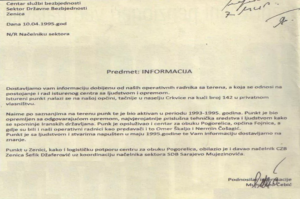 Punkt je sa ljudstvom i stvarima napušten u maju 1995. godine te vam informaciju dostavljamo na znanje. Punkt u Zenici, kao i logističku potporu Centru za obuku Pogorelica, obilazio je i davao načelnik CSB Zenica Šefik Džaferović uz koordinaciju načelnika sektora SDB Sarajevo Envera Mujezinovića.