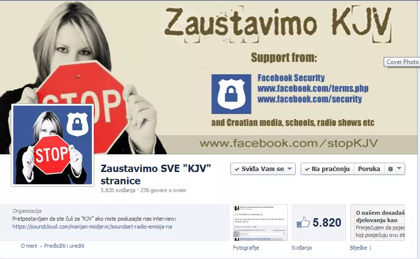 Facebook stranica iz Hrvatske „Zaustavimo SVE "KJV" stranice“ čiji se administratori već duže vrijeme bore protiv uvredljivih sadržaja koji se objavljuju na ovoj društvenoj mreži, do sada je, kako nam je rečeno ugasila više od 70 stranica nasilnog, uvredljivog i seksualnog sadržaja, javlja bh. novinska agencija Patria (NAP).