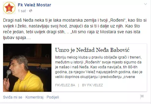 ” Napustio nas je Nedžad Babović! Izražavamo sućut njegovoj porodici i svim navijačima Veleža! Zauvijek će ostati dio porodice Veleža!”