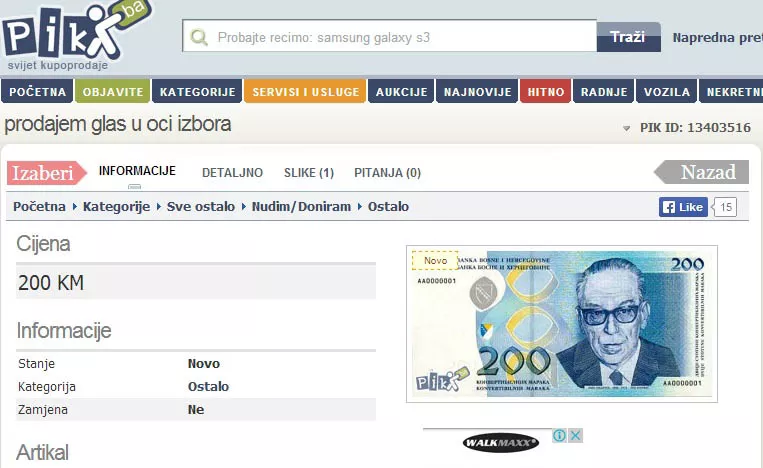 Čak nije preciziran ni način plaćanja, ali cijena je fiksan 200 KM. Ne sumnjamo da ovakvih oglasa biti još, a oni su sigurno dokaz koliko su ljudi u BiH nezadovoljni postojećim stanjem i svime onim što se dešava uoči svakih izbora.