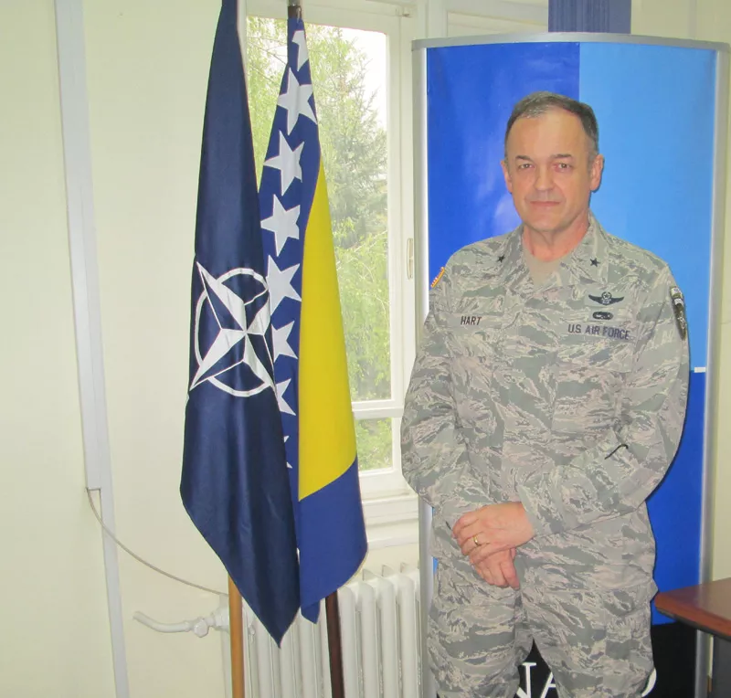 HART: Što se tiče napretka BiH ka NATO-u na političkom nivou taj napredak je ograničen. Što se tiče Oružanih snaga BiH i njihovog napretka on je prilično dobar. Oružane snage se moderniziraju koliko to mogu. Provode politike, programe, obuku prema NATO standardima. Ove sedmice otišla je osma rotacija vojnika iz sastava 4. pješadijske brigade u misiju ISAF u Afganistan. Meni kao komandantu NATO Štaba, ali i mojim prethodnicima, namjera je da Oružane snage BiH i Ministarstvo odbrane BiH učinimo „otokom izvrsnosti“ u Vijeću ministara BiH pa da onda to Ministarstvo ima domino efekat na ostala ministarstva i državu.