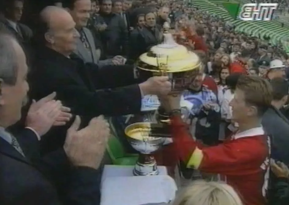 Na fotografiji prvi predsjednik Predsjedništva BiH rahmetli Alija Izetbegović uručuje trofej tadašnjem kapitenu i sada treneru u omladinskom pogonu Sarajeva Almiru Turkoviću popularnom Zeki. Na fotografiji se vidi i Jusuf Pušina, tadašnji čelnik Nogometnog saveza BiH.