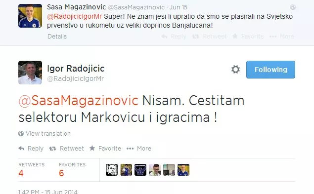 Naime na Twitter profilu Magazinović je upitao Radojičića da li zna da se BiH plasirala na SP u Kataru, na šta je Radojičić odgovorio da nije znao?!.