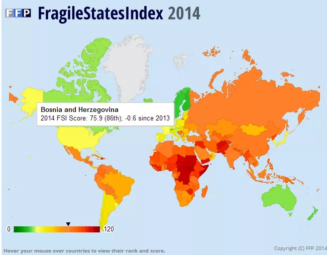 Kada su ova istraživanja objavljena prvi put 2005. godine, Bosna i Hercegovina zauzimala je 22. mjesto i nalazila se u grupi sa Ruandom, Afganistavnom, Keniom i drugim rizičnim zemljama. Danas ona zauzima 86 mjesto. To je prema ovoj statistici za oko četiri puta bolje nego prije deset godina, no to još uvijek nije dovoljno da bi bili svrstani u stabilne zemlje.