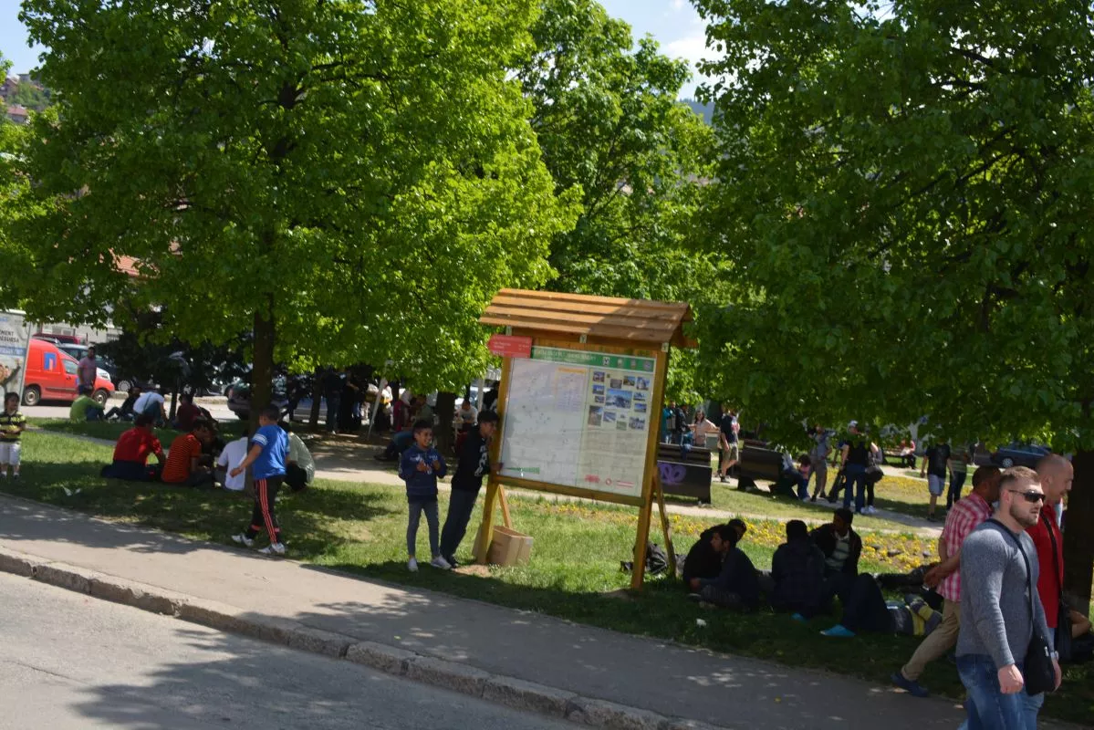 U parku preko puta Vijećnice grupa građana se, bez ikakve podrške nadležnih državnih vlasti, organizovala i počela pružati pomoć pristiglim izbjeglicama iz ratom i nasiljem zahvaćenih zemalja Bliskog istoka, Azije i Afrike. Po njihovim riječima, niko od organa vlasti, osim današnje posjete iz Općine Stari Grad i Centar, nije obišao izbjeglice niti ponudio rješenje, a već nekoliko dana izbjeglice konstantno pristižu. Na ovoj lokaciji je trenutno oko 300 izbjeglica, među njima mnogo žena, djece, bolesnih i iznemoglih.