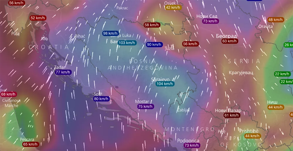 Pred nama je izrazito jaka promjena vremena, možemo slobodno reći i najjača za ovu godinu. Snažno i veoma duboko ciklonalno polje u Genovskom zaljevu obrazovat će snažan gradijent, tj. razliku pritisaka između sjevera i juga Balkana, što će za posljedicu imati razorne vjetrove, nerijetko i do orkanske snage, jer bi udari vjetra mogli prelaziti čak 100 km/h i u Sarajevu! Generalno gledano, udari vjetra bi se kretali većinom iznad 70 km/h u najmanje 90% naše zemlje. Ovaj vjetar najavljujemo tek za ponedjeljak i utorak, 11. i 12. decembar, kada će biti potencijalno opasno vrijeme za stanovništvo, što bi trebalo regulirati na način da nadležne instance urgentno proglase crveni stepen meteoalarma za veći dio Bosne i Hercegovine na opasne vremenske prilike.