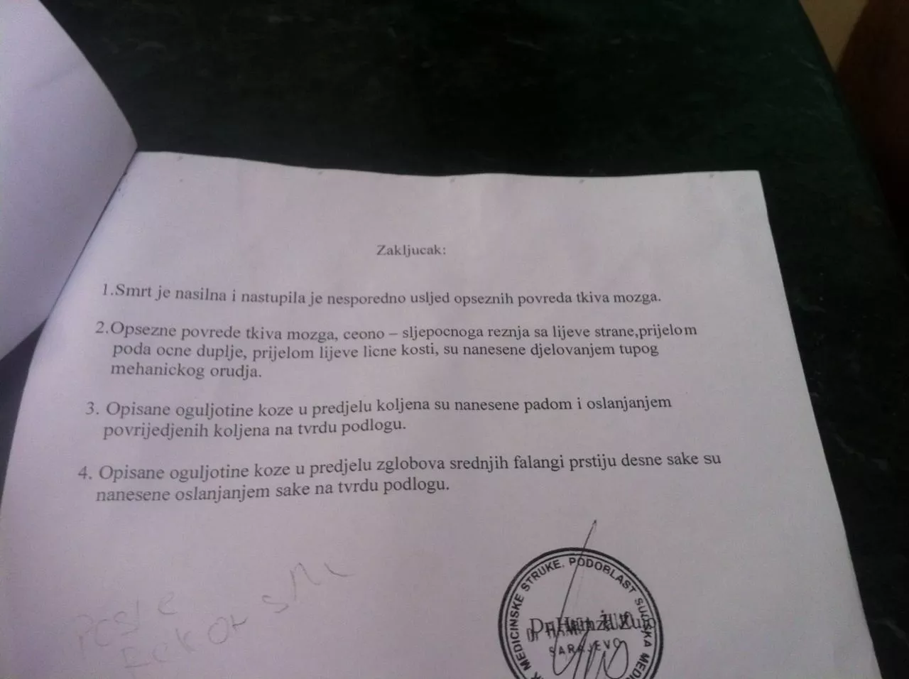 U njemu su jasno navedene sve povrede pronađene na tijelu i način na koji su one mogle nastati. U zaključku se navodi da je smrt nasilna, te da je su povrede nanesene djelovanjem tupog mehaničkog oruđa.