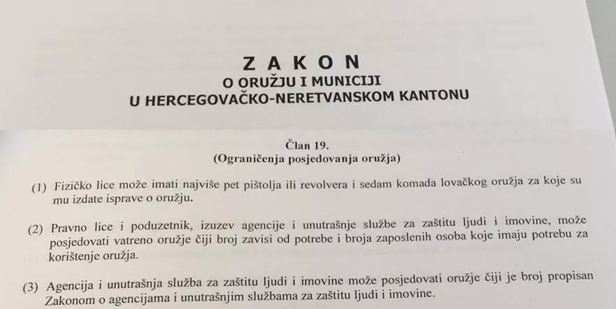 I dok se istovjetnim zakonom u Kantonu Sarajevo fizičkom licu dozvoljava da može imati samo jedan pištolj i jedan revolver uz uredno izdate dozvole, u Hercegovini su predlagači zakona odlučili da jedna osoba može imati cijeli arsenal oružja i za njega dobiti dozvolu, piše Patria.