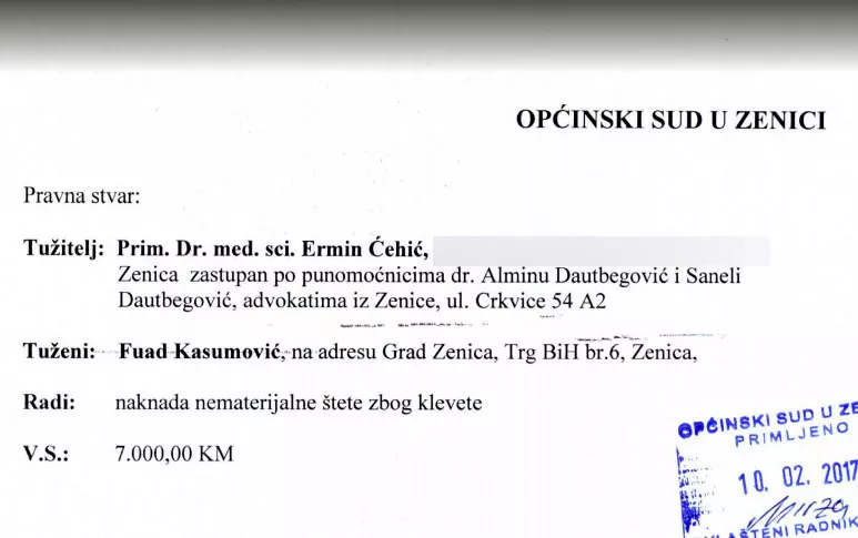 Dr. Ermin Čehić tužio je zbog klevete gradonačelnika Zenice Fuada Kasumovića, nakon što je Kasumović Čehića optužio da potkupljuje gradske vijećnike u Zenici. Čehić je u tužbi od Kasumovića zatražio 7.000 KM odštete.