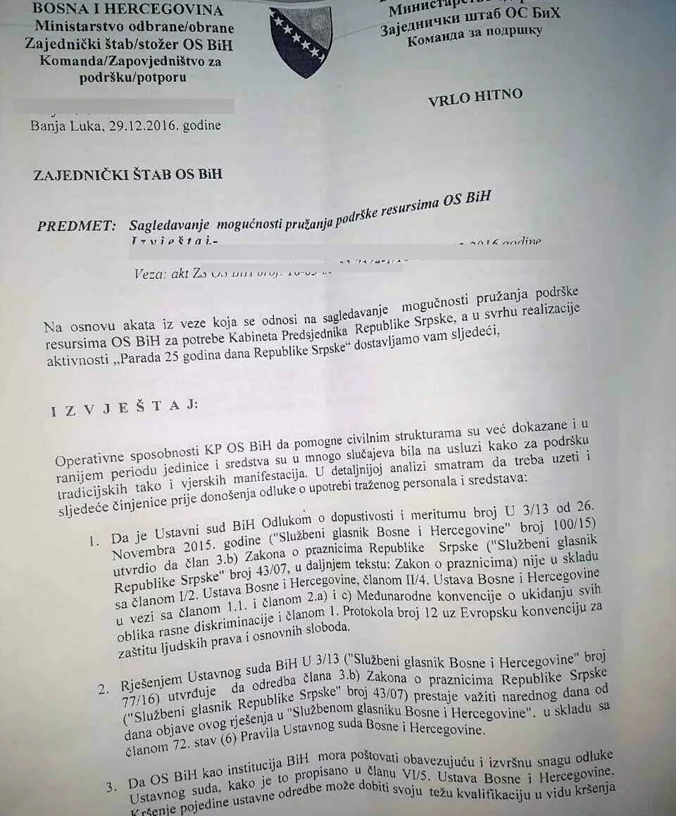 Novinari agencije Patria imali su prilike vidjeti sadržinu jednog od tih dopisa upućenog Zajedničkom štabu OS BiH koji jasno pokazuju da je još 29. decembra 2016. godine upozoreno da „OS BiH kao institucija BiH mora poštovati obavezujuću i izvršnu snagu odluke Ustavnog suda, kako je to propisano u Ustavu BiH“ u kontekstu 9. januara Dana RS koji je proglašen neustavnim.