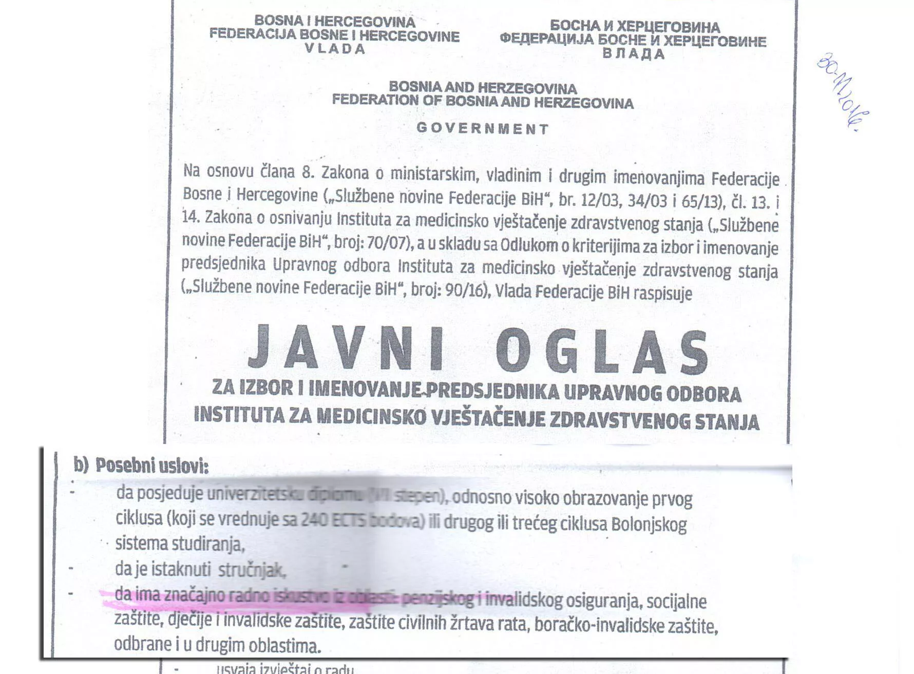 Nakon izbora članova, 30. novembra prošle godine raspisan je konkurs za izbor i imenovanje predsjednika Upravnog odbora instituta za medicinsko vještačenje. U posebnim uslovima se od budućeg rukovodioca ne traži ono što se tražilo za izbor članova Upravnog odbora. Dok se od članova Upravnog odbora tražilo iskustvo u medicinskom vještačenju, od prvog čovjeka se ne traži ništa slično. Očito, budući rukovodilac Instituta to iskustvo nema. Pošto je vršilac dužnosti predsjednika Uprave Kenan Spahić, koji nema to iskustvo, jasno je da se konkurs ovih dana namješta da on poziciju definitivno preuzme.
