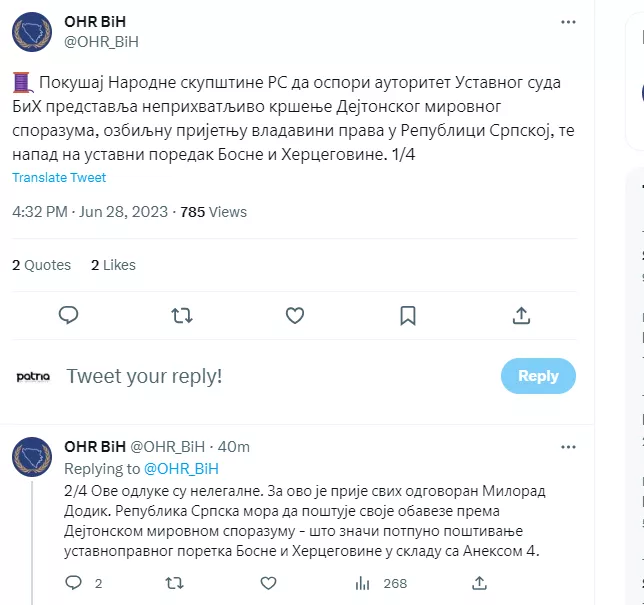 "Prvi korak je odbacivanje bizarnog i avanturističkog podrivanja Dejtona i dejtonskih institucija od strane Milorada Dodika. Naš zajednički prioritet je prosperitetna budućnost za sve građane BiH, i da njihova volja bude ispoštovana u rezultatima slobodnih demokratskih izbora", zaključuju iz OHR-a.